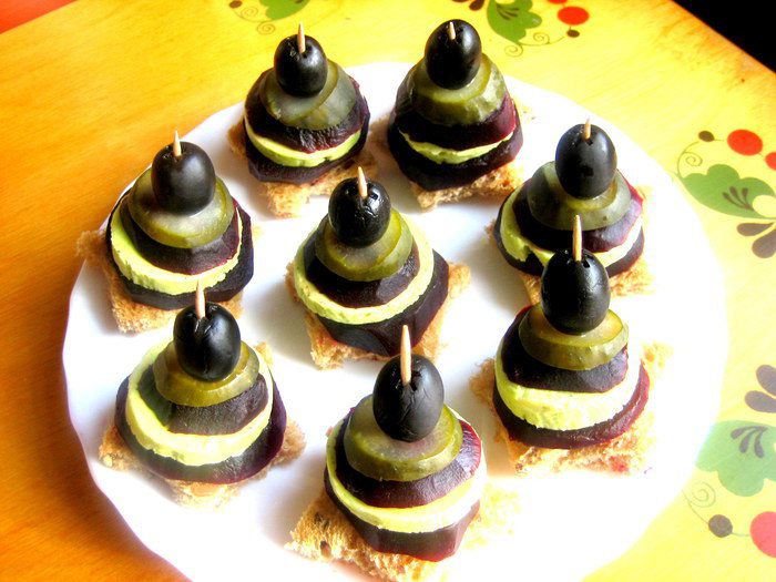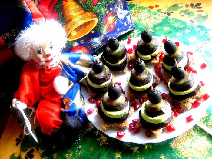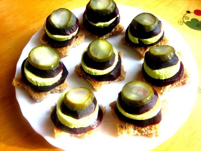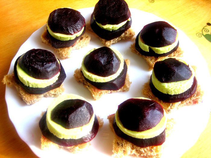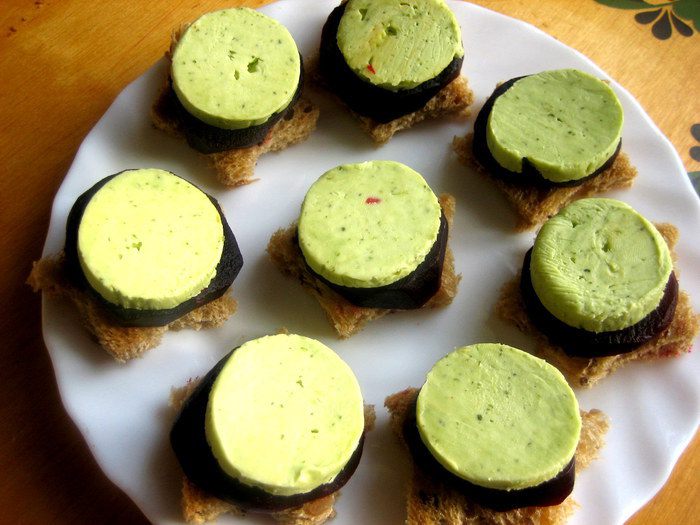 Придумалась такая закуска спонтанно ...Из имеющихся продуктов нужно было придумать в дополнение к "паштету-грибу" что-нибудь интересное сыну на работу (там уже ждут на застолье!),так как в Латвии вчера был гос. праздник!!! P.S. Зелёное масло можно приготовить заранее самим (я покупала),добавив в обычное: зелень,чеснок,чили и др. любимые приправы...