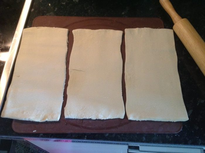 Разогреваем эл.духовку до 220 С разделяем тесто на три части, раскатываем каждую в прямоугольник размером 12*25 см. Выпекаем около 12 мин, пока коржи не поднимутся и не станут золотистого цвета. Остужаем.