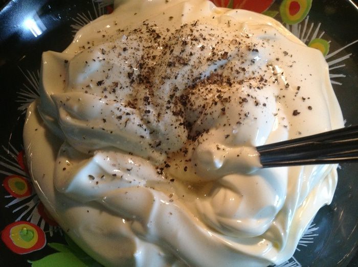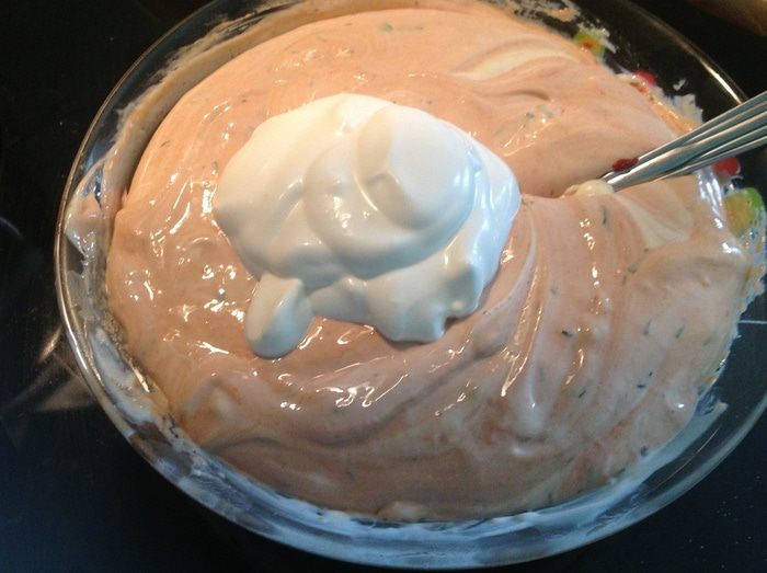 Разминаем сливочный сыр, смешиваем с лимонным соком, солью, перцем, укропом, томатной пастой и майонезом...
