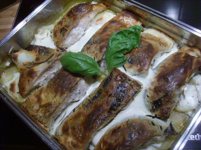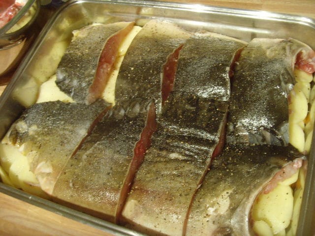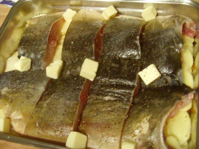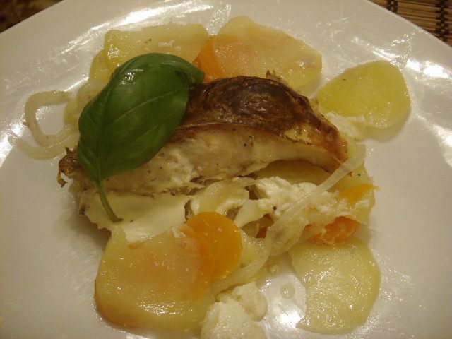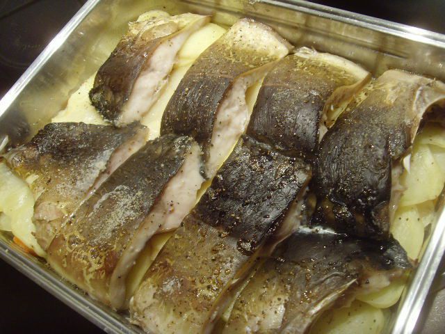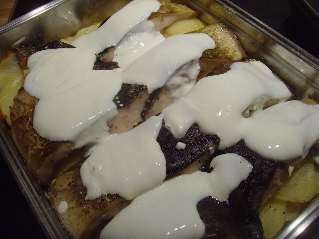 Сметану присолить, при желании можно разбавить майонезом и добавить зелень. Рыбу залить смет. соусом и запекать до готовности картофеля.