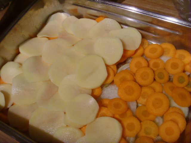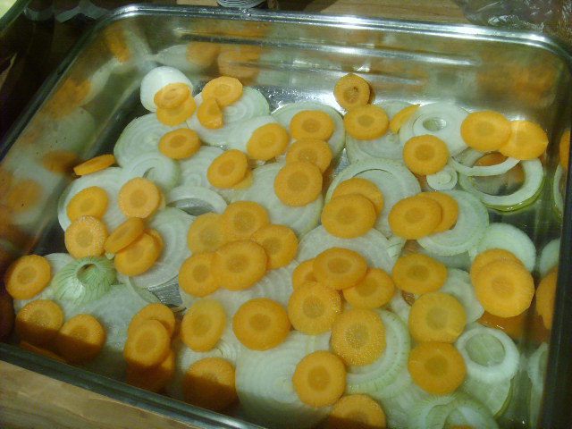 Лук, морковь, картошку очистить и нарезать тонкими кольцами. В форму для запекания сложить пластами лук, морковку и
