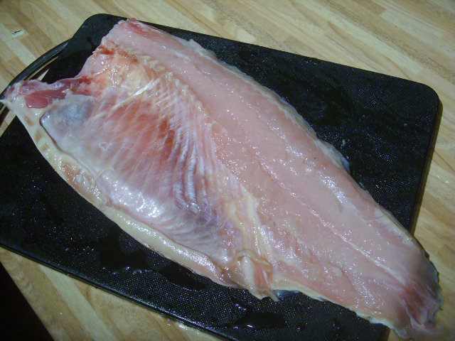 Рыбу разделать на филе. Посолить, поперчить.