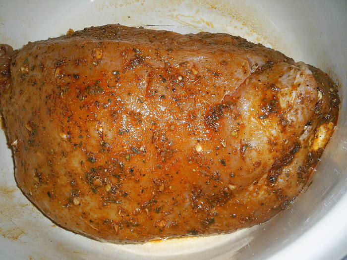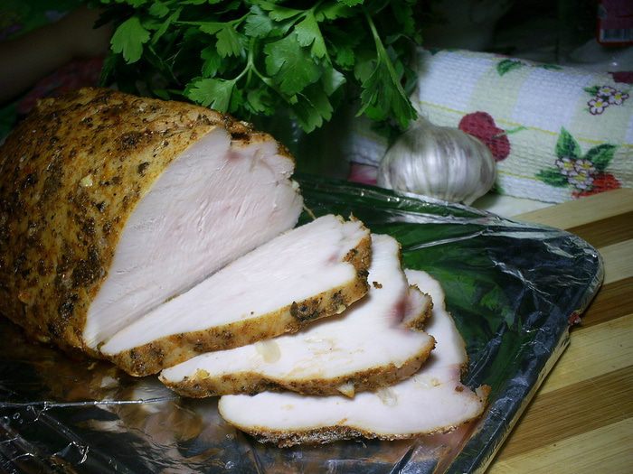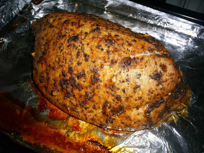Духовку разогреваем до 250 градусов. Индейку выкладываем на противень с фольгой и отправляем в горячую духовку, температуру сразу же убавляем до 200 градусов. Запекаем 30-35 минут (не больше). Даем буженине полностью остыть в духовке.