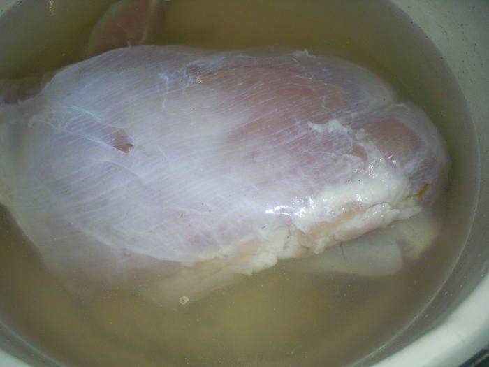 Из соли и воды приготовить раствор. Залить им индейку, если вода не будет полностью покрывать мясо можно немного добавить. Оставить индейку в рассоле на 2-3 часа.