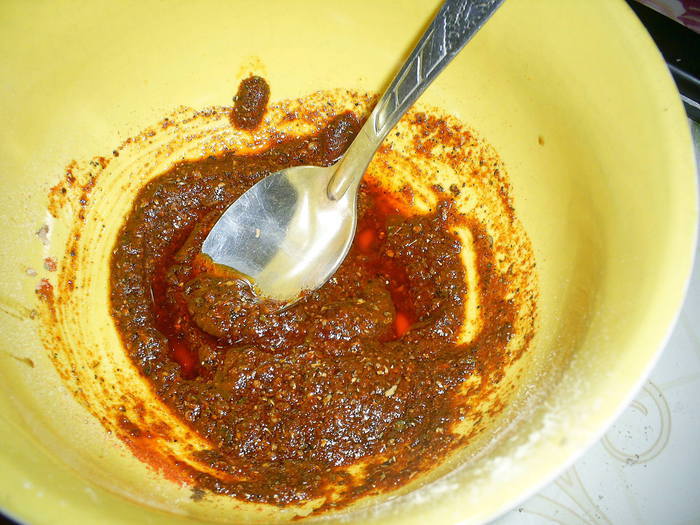 Смешать все сухие приправы, добавить туда горчицу, соевый соус и масло. Перемешать.