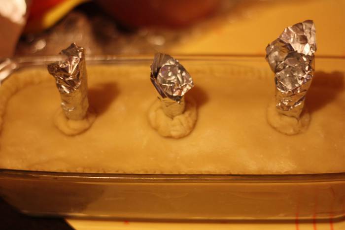 Делаем в тесте 3 отверстия, вставляем туда воронки из фольги,дырочки должны быть не маленькие, у меня они диаметром с карандаш.