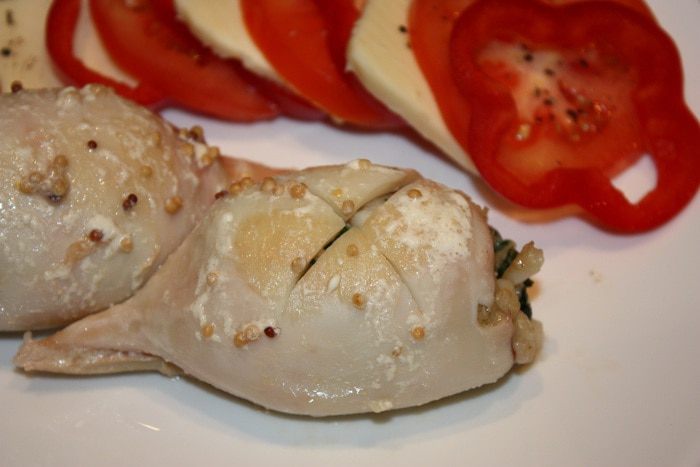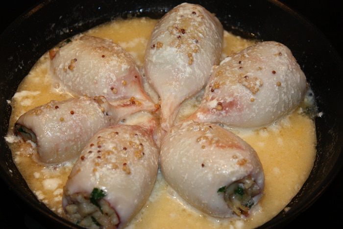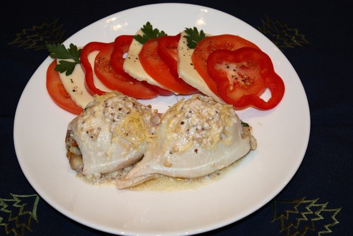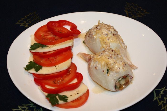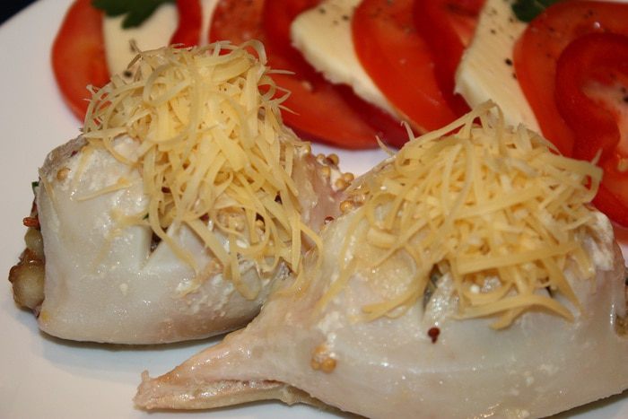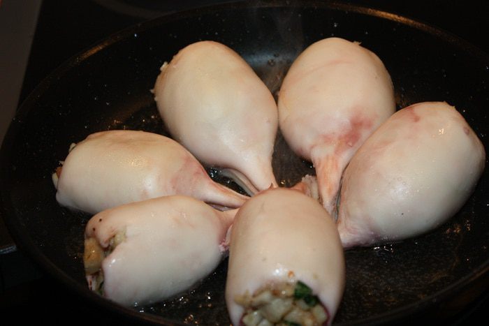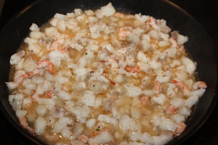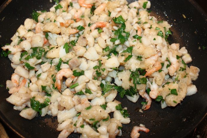 Кальмары опустить в кипящую воду на 1 минуту, почистить, удалить внутренности и обрезать хвостики. Креветки опустить в кипяток на 2 минуты, почистить и порезать на кусочки. Филе масляной рыбы тоже порезать на кусочки. Срезать корочку у белого хлеба, мякиш порезать на кусочки. Петрушку и чеснок мелко порезать.