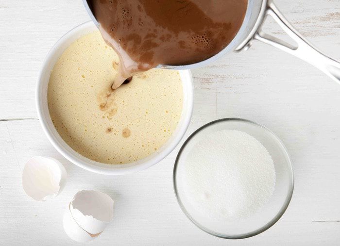 Влить молоко со сливками снова в кастрюлю, добавить шоколад и растопить его на медленном огне, не доводя до кипения.