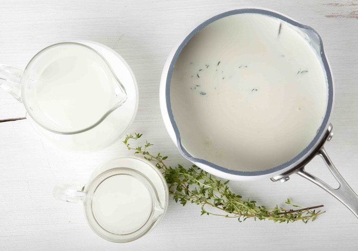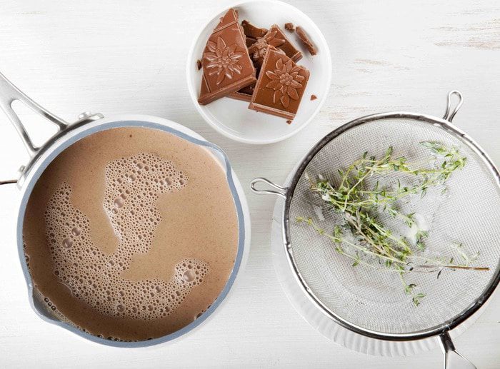 Соединить сливки, молоко и тимьян в небольшой кастрюле и довести до кипения, затем процедить через сито.