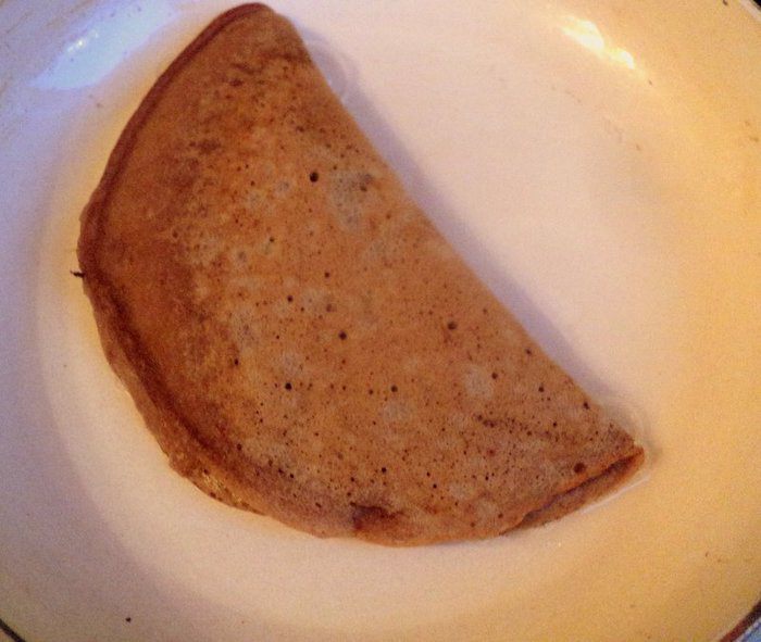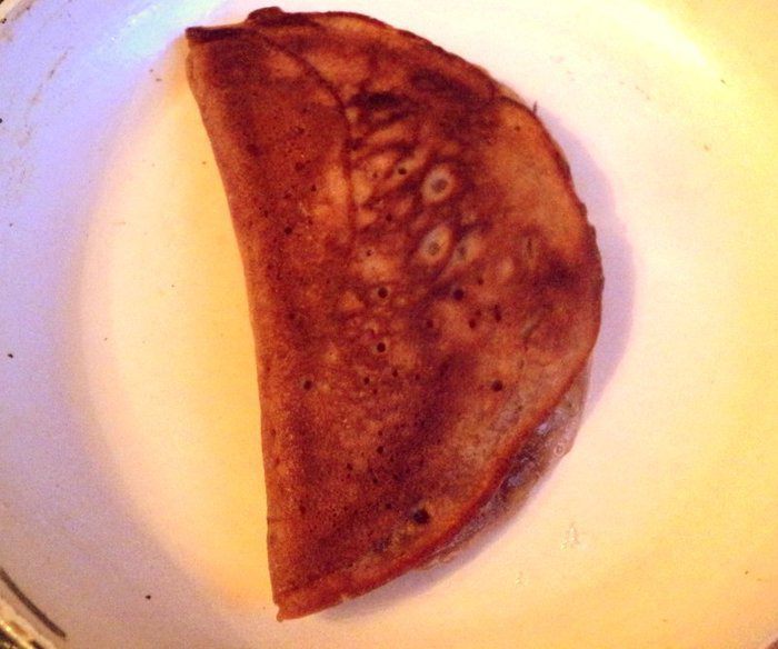 Нагреть сковородку, смазать маслом, налить 1 половник теста, чтобы получился не толстый блинчик.