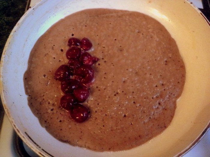 Сразу же, пока блин не схватился, выложить немного вишневой начинки на одну сторону блина, оставив свободными края.