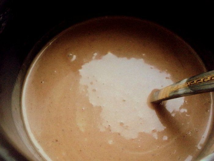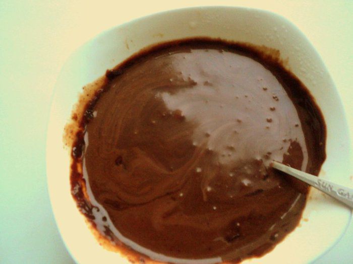 В кефир добавить яйца, 2 ст.ложки сахара, соль, соду и хорошо перемешать венчиком. Добавить муку, перемешать до однородной массы, затем растопленный шоколад и 70 мл растительного масла, перемешать.