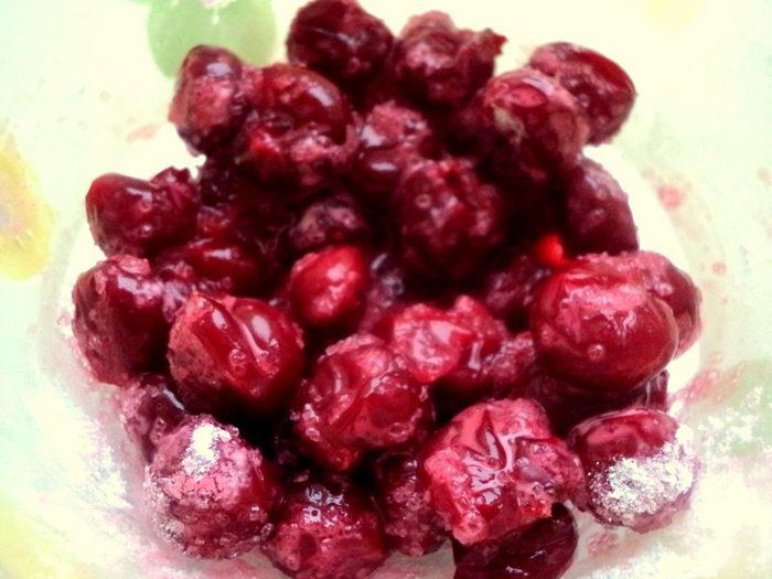 Вишню разморозить, удалить косточки, дать немного постоять и слить выделившийся сок. Добавить 2 ст.ложки сахара и крахмал, перемешать.