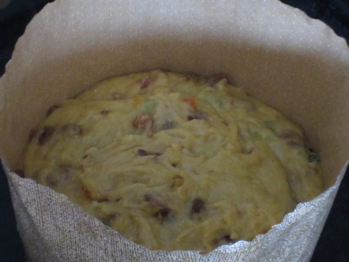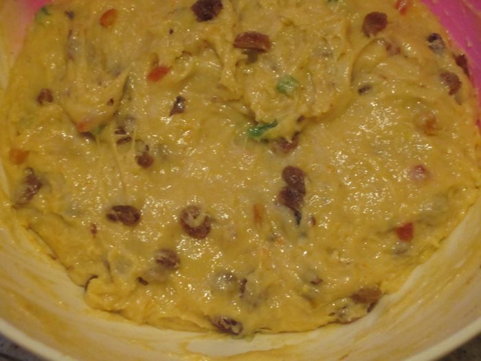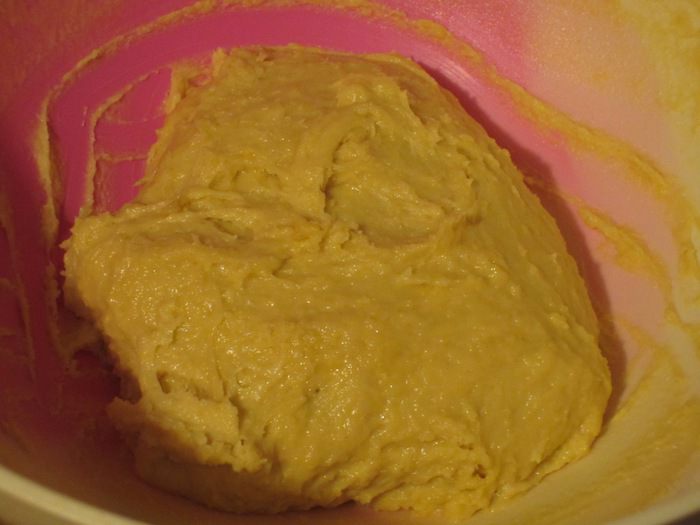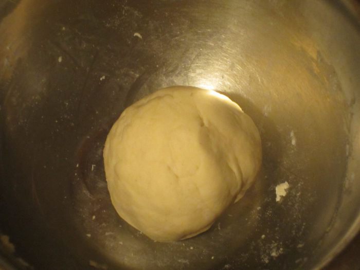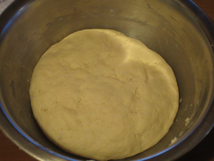 3-й этап. Требуемые ингредиенты: 220 г муки, 100 г сахара, 2 яйца, 3 желтка, соль, 100 г сливочного масла комнатной температуры, лимонная цедра, цукаты, изюм (хорошо отжатый), ванилин. В тесто ввести яйца, желтки, муку и хорошо вымесить (не менее 10 минут) до эластичного состояния. Добавить сахар, соль, ванилин, сливочное масло, цукаты, изюм, цедру и вымесить тесто до однородного состояния. Накрыть пищевой плёнкой и опять отправить в разогретую до 30 °С духовку на 2 часа (тесто должно увеличиться в объёме вдвое).