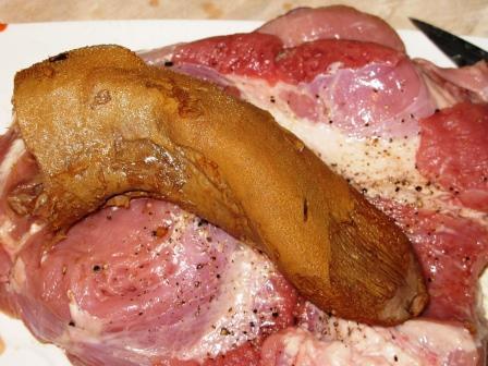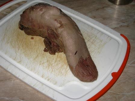 Вырезку надрезать не до конца, раскрыть как книгу, слегка отбить, выравнивая по толщине. Посыпать солью, перцем, укропом. Можно натереть чесноком. Завернуть в нее язык, и обмотать получивший ся рулет кулинарной нитью. Извините за пошлое фото, но из песни слов не выкинешь! Я не специально, честное слово!