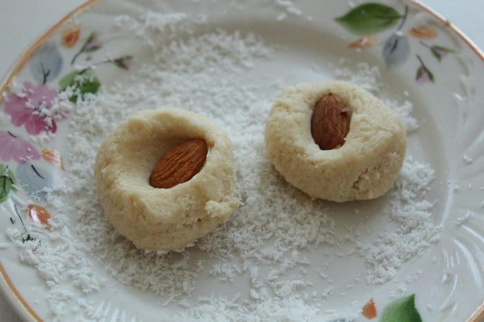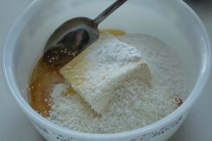Из муки, меда, масла, оставшейся кокосовой стружки и сахарной пудры замесить тесто.