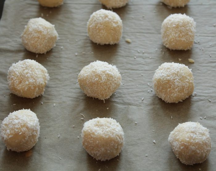 Скатываем шарик и обваливаем в кокосовой стружке. Выкладываем печенье на противень с пекарской бумагой и выпекаем примерно 15-20 минут.