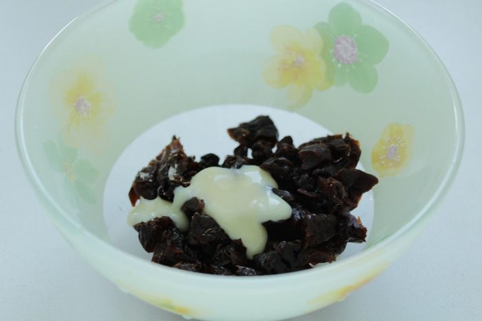 Для начинки чернослив порезать мелко, добавить сгущенное молоко перемешать.