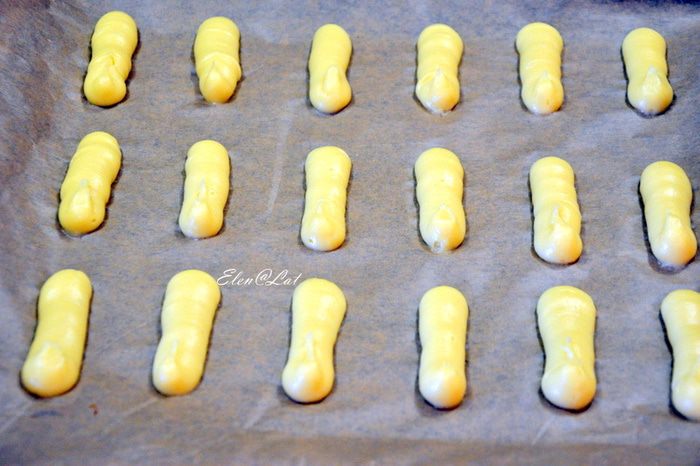 Отсадить тесто на противень, застеленный пергаментом. Эклеры можно выпекать любой формы, у меня классический вариант.