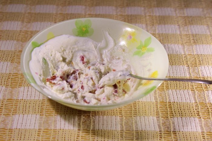 В тот же день сделать крем сыр. Молоко перелить в кастрюлю с толстым дном, добавить сметану, сливки, соль и поставить на средний огонь. Как только появятся первые пузырьки, но не доводя до кипения, добавить сок лимона и держать на огне 3-5 минут. Молоко должно свернуться. После снять с огня, закрыть крышкой и оставить до полного остывания. Как остынет, сложить в несколько слоев марлю, выложить в дуршлаг и слить молоко. В марле останется наш сыр, подвесить его и дать стечь минут 15-20. Сыр убрать в холод.