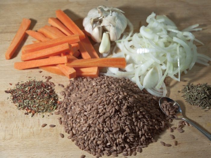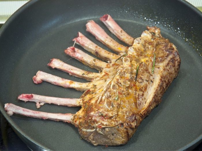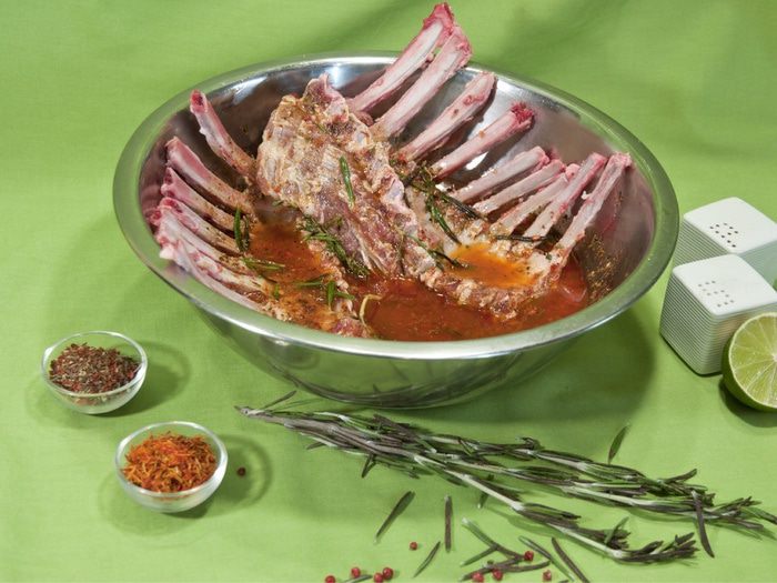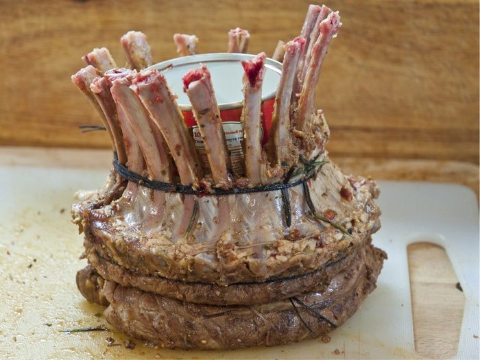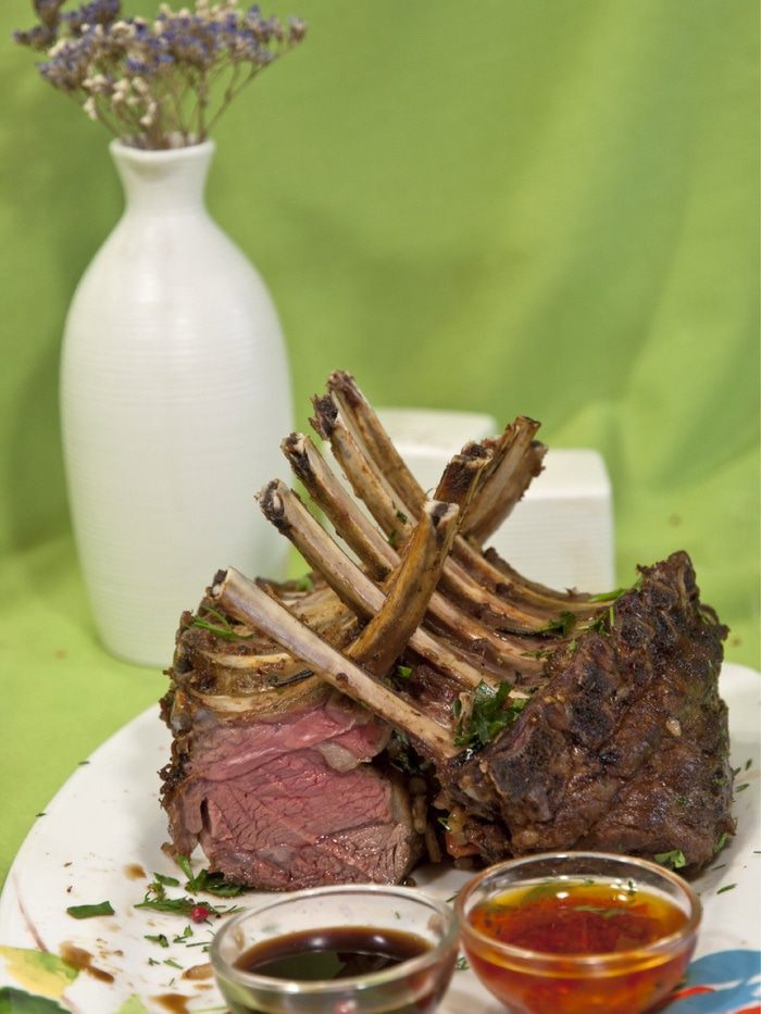 Оголенные ребрышки оборачиваем фольгой и подготовленную корону отправляем в духовку, предварительно разогретой до 200*С, примерно на 14-15 минут. Контролирует степень прожарки. И обязательно даем мясу отдохнуть. А в это время начинаем декодировать блюдо зеленью и помидорами Черри. Затем в центр укладываем "корону", внутрь укладываем рис и украшаем срезанной поперек головкой чеснока.