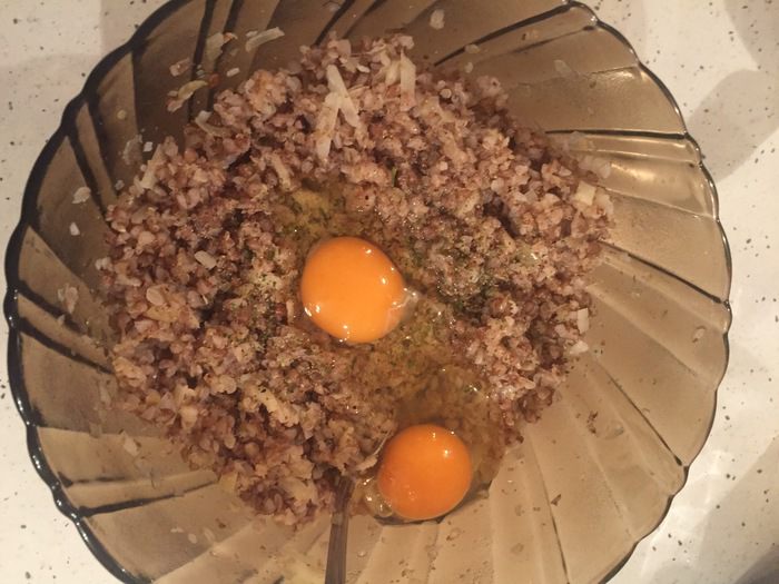 В готовую смесь гречки с киноа добавляем яйца и перемешиваем.