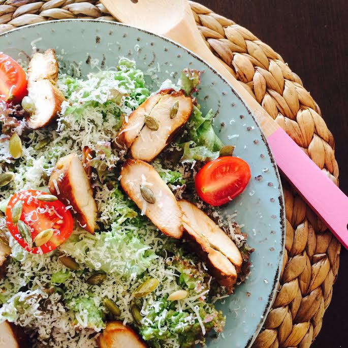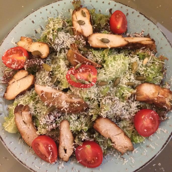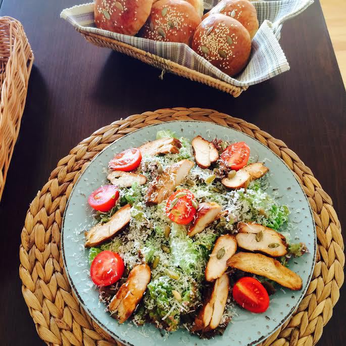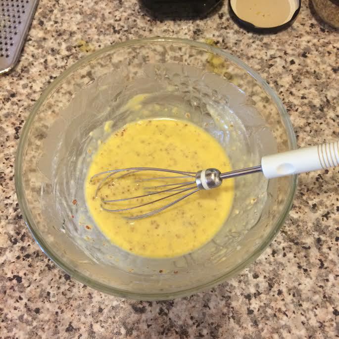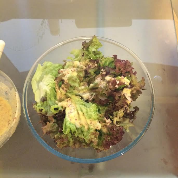 В этот салат я всегда добавляю куриную грудку, получается сытно и полезно. Делайте на свой вкус, грудку можно сварить, а можно замариновать в соевом соусе и лимонном соке, а потом обжарить. Заправка: вареный желток хорошо размять. Чеснок натереть на мелкой терке, добавить к желтку, положить горчицу и перемешать. Начать постепенно добавлять сок лимона и оливковое масло, хорошо взбить венчиком.