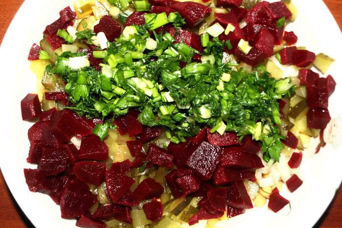 Добавить нарезанную свеклу, зелень.