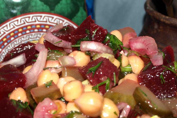 Салат из нута со свеклой и солеными огурцами — это отличная альтернатива винегрету. Нут хорошо сочетается со свеклой и растительным маслом. Салат очень сытный и полезный.