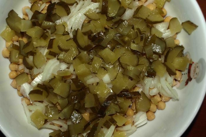 К 300 г готового нута добавить нашинкованный лук, мелко нарезанные огурцы.