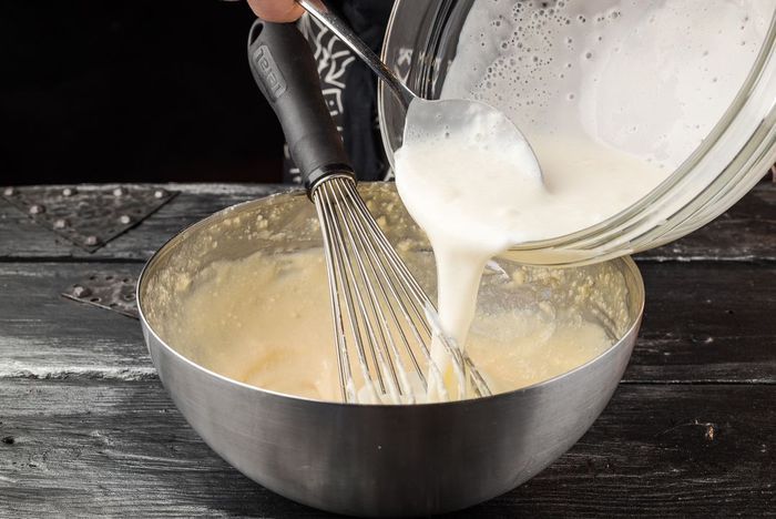 Непрерывно перемешивая, ввести кефир с содой, всыпать ¼ ч. ложки соли и муку.