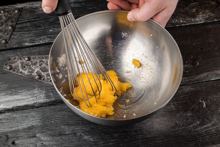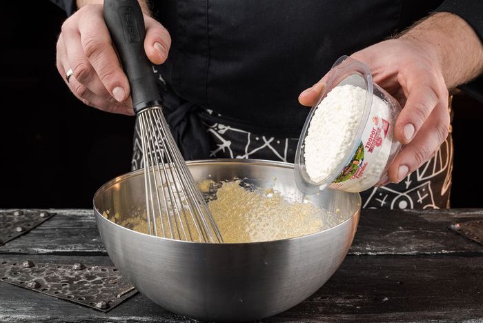 Добавить к желткам творог «Домик в деревне» и перемешать до получения гладкой массы.