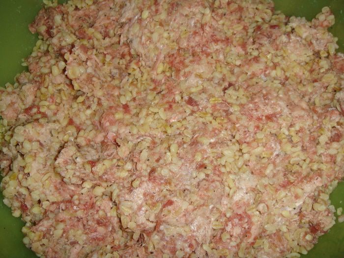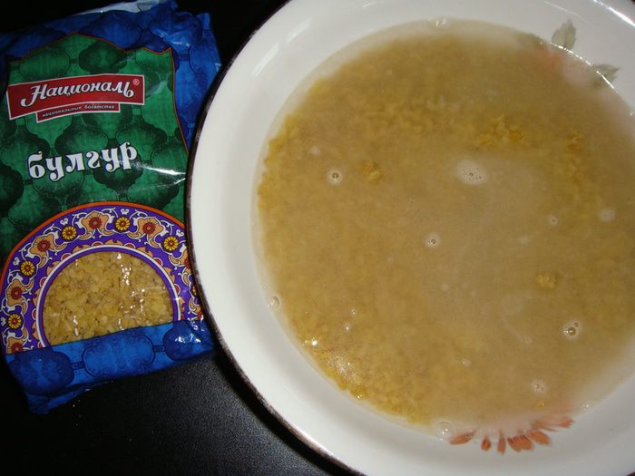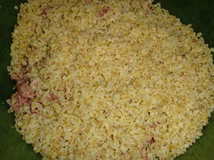 Булгур за 2 часа напитался водой. Лишнюю воду слить. Булгур добавить к фаршу.