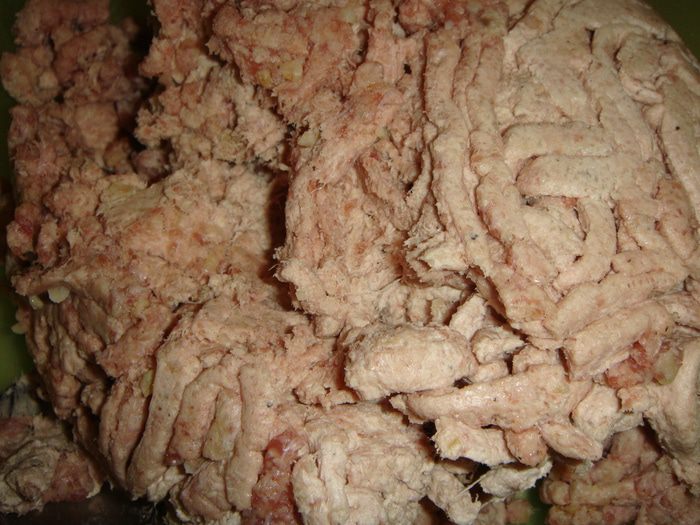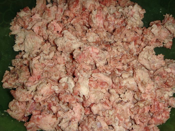 Пропустить фарш через мясорубку. Если фарш получился слишком сухой, добавьте немного водички и перемешайте.