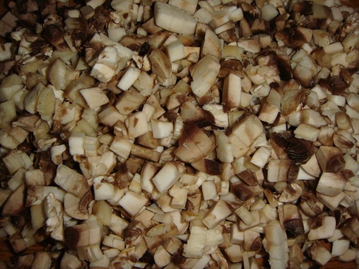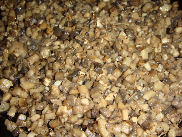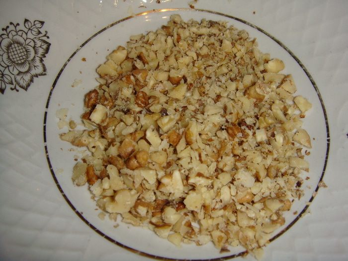 Грецкие орехи порубить ножом, добавить к остывшим грибам и перемешать.