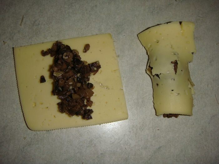 На кусочек сыра выкладываем грибы и сворачиваем в рулетик. Можно сыр нарезать брусочками. Я делала и так, и так, вкус от этого не меняется.