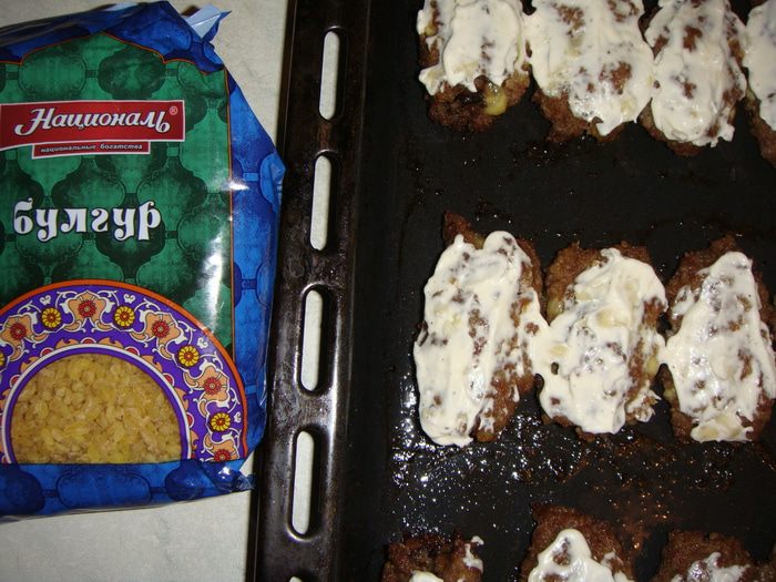 Через 20 минут смазать кеббе чесночно-майонезным соусом и запекать еще 10 минут.