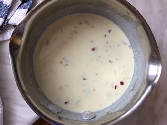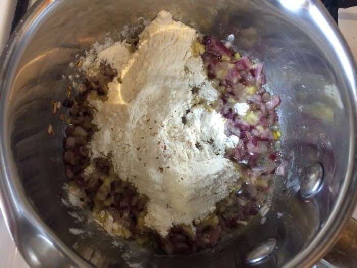 Начните готовить соус. Мелко порубите лук, растопите масло в сотейнике на небольшом огне и жарьте лук 15 минут, регулярно помешивая, до мягкости. Насыпьте в лук муку, перемешайте, а затем постепенно влейте молоко, тщательно перемешивая.