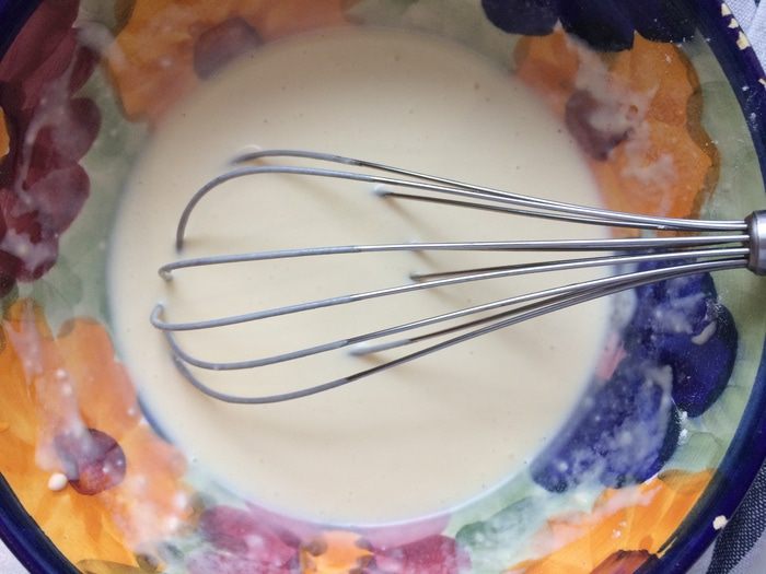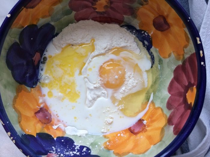 Тем временем займитесь тестом для блинов. Растопите сливочное масло и дайте ему немного остыть; насыпьте в миску муку и щепотку соли, сделайте в центре колодец, выпустите в него яйца, добавьте молоко и 70 мл воды, хорошенько перемешайте.