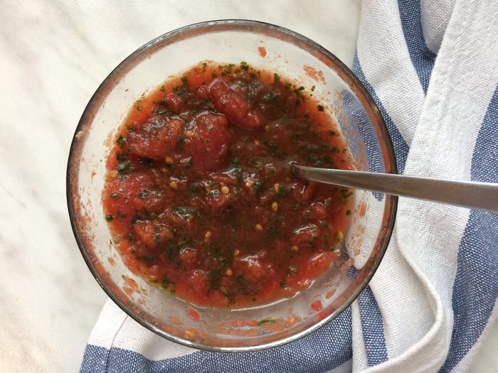 Помидоры нарежьте (сок из банки слейте в стеклянную банку и уберите в холодильник, он нам не понадобится). Мелко порубите листья базилика, мелко натрите лимонную цедру и перемешайте то и другое с помидорами, парой ложек уксуса и большой щепоткой морской соли.