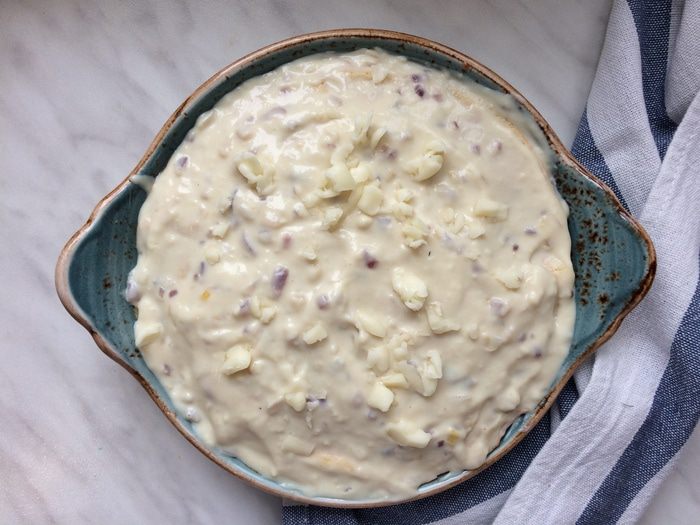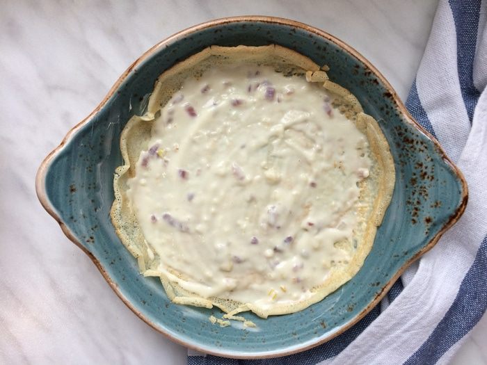 Разогрейте духовку до 180°С. Возьмите глубокую жаропрочную сковороду диаметром 26 см. Соберите запеканку: первый слой блина, затем луковый соус.