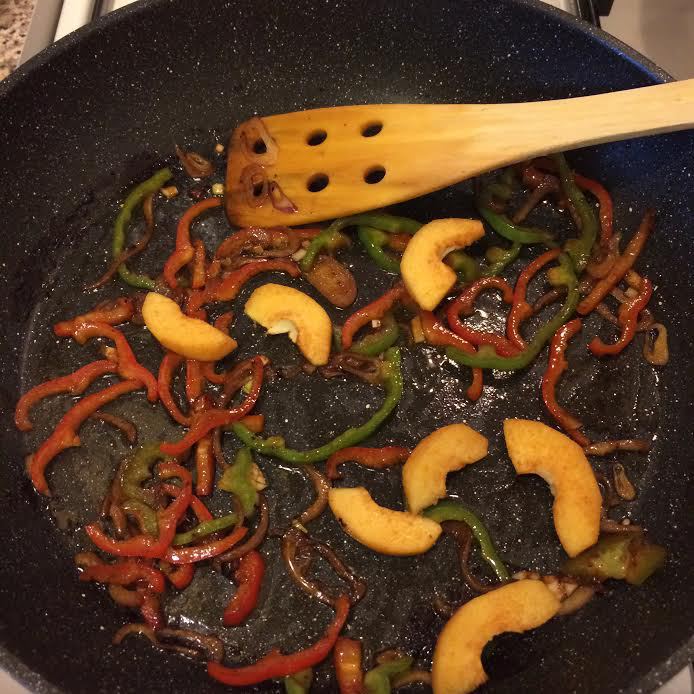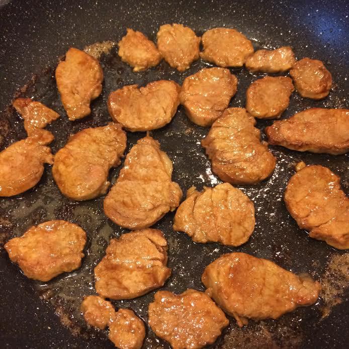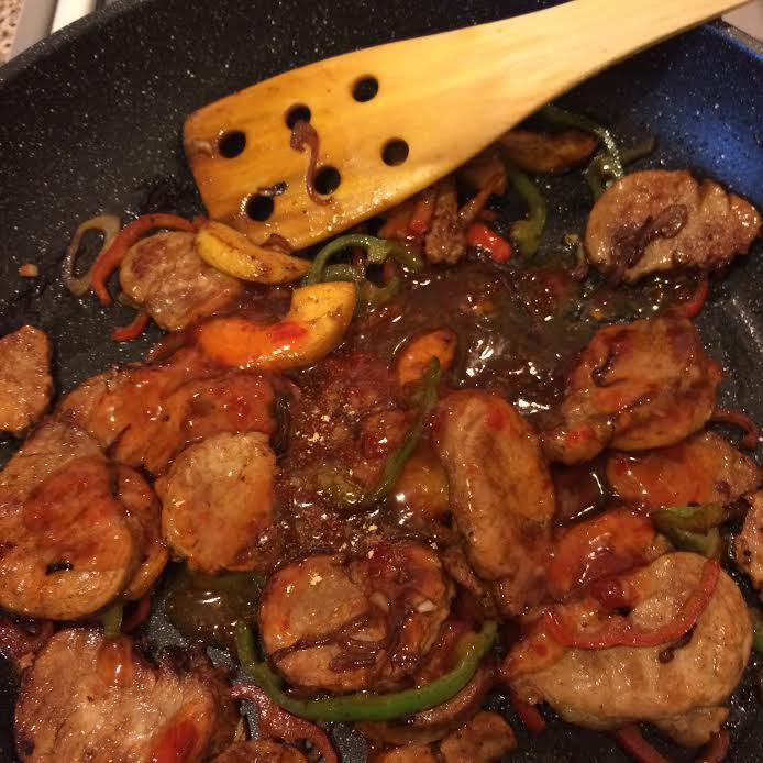 Затем добавляем мясо, соус, корицу, имбирь и перемешиваем аккуратно, тушим 1 минуту и снимаем с огня.