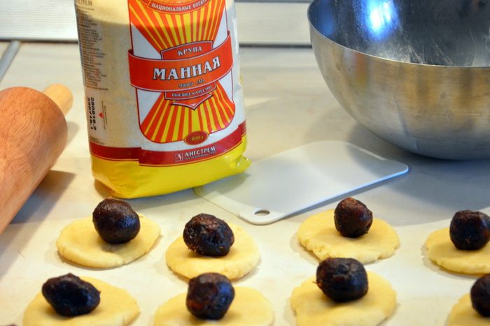 Раскатать из теста круглые лепешки, из финиковой пасты слепить шарики и выложить их на тесто.