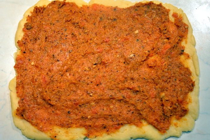 Другую часть теста раскатать в пласт, смазать ореховой начинкой.