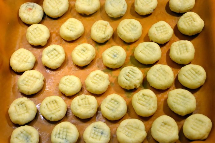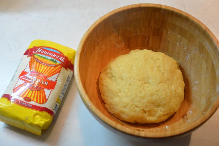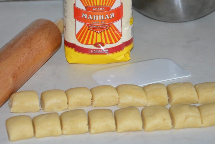 Достать тесто из холодильника, обмять и дать отогреться. Где-то 2/3 теста скатать колбаской и разрезать на маленькие куски. Можно просто отщипывать от большого куска теста.