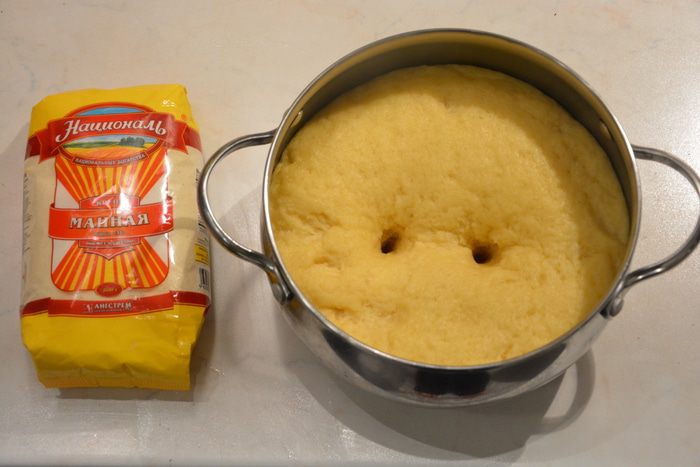 Обмять подошедшее тесто. Снова накрыть тесто пищевой пленкой и убрать в холодильник на ночь.