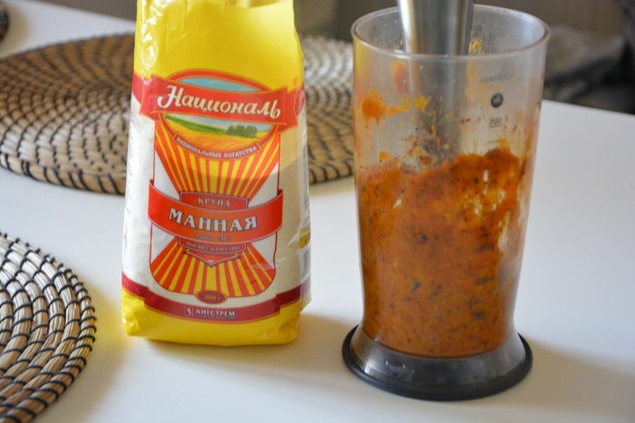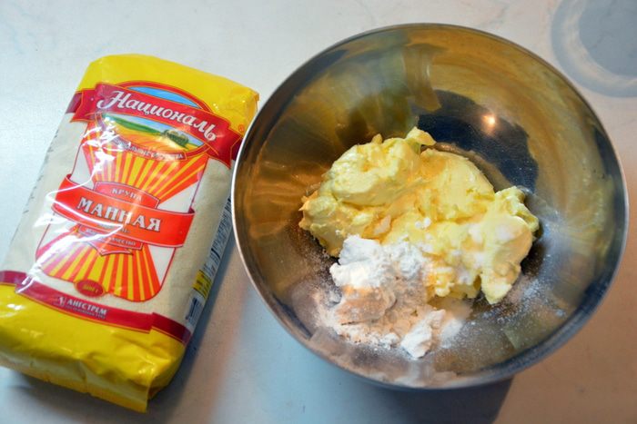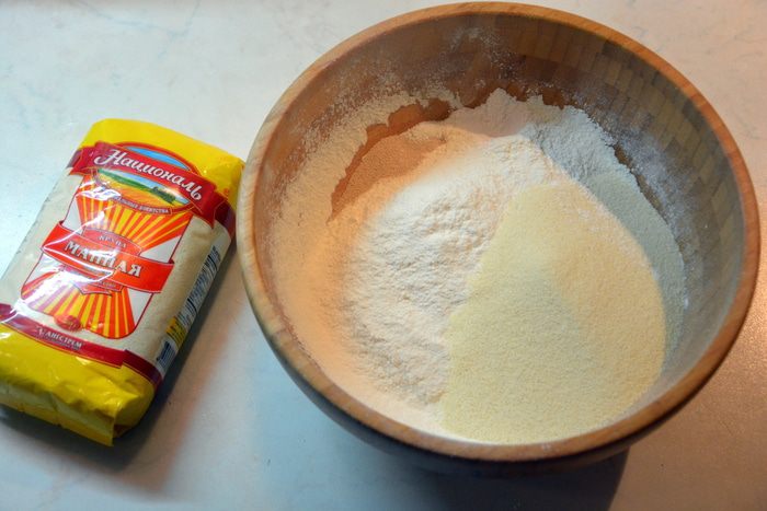 Отдельно соединить сухие ингредиенты: муку, манную крупу ТМ «Националь», разрыхлитель и дрожжи. Перемешать. Муки возьмите 400 г, далее будете добавлять по мере необходимости.