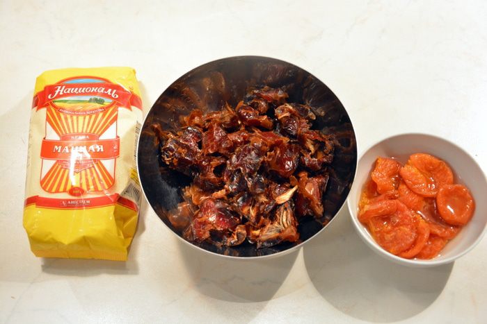 Удалить косточки у фиников, курагу помыть и замочить в воде (на ночь).
