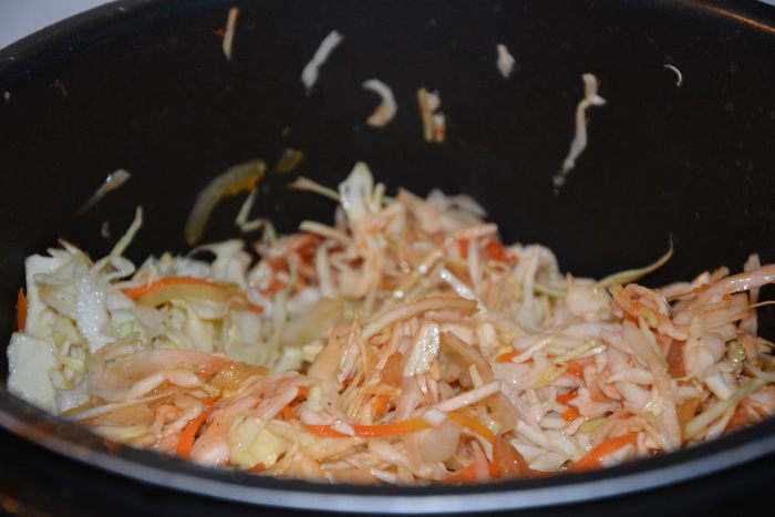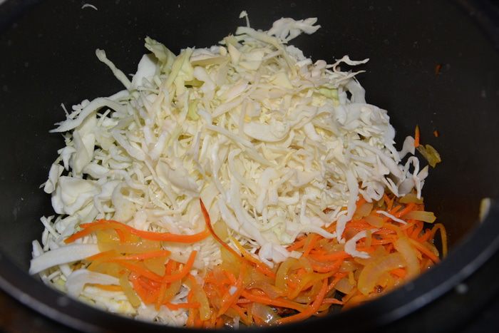 Лук и морковь режем соломкой и пассеруем в мультиварке на растительном масле в режиме «жарка». К ним же добавляем капусту.