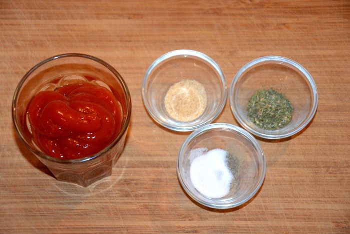 Приготовим специи: чеснок, петрушка, соль, перец, кетчуп (у меня heinz).